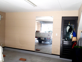 車をぶつけてできたガレージの壁面のへこみを補修致しました。